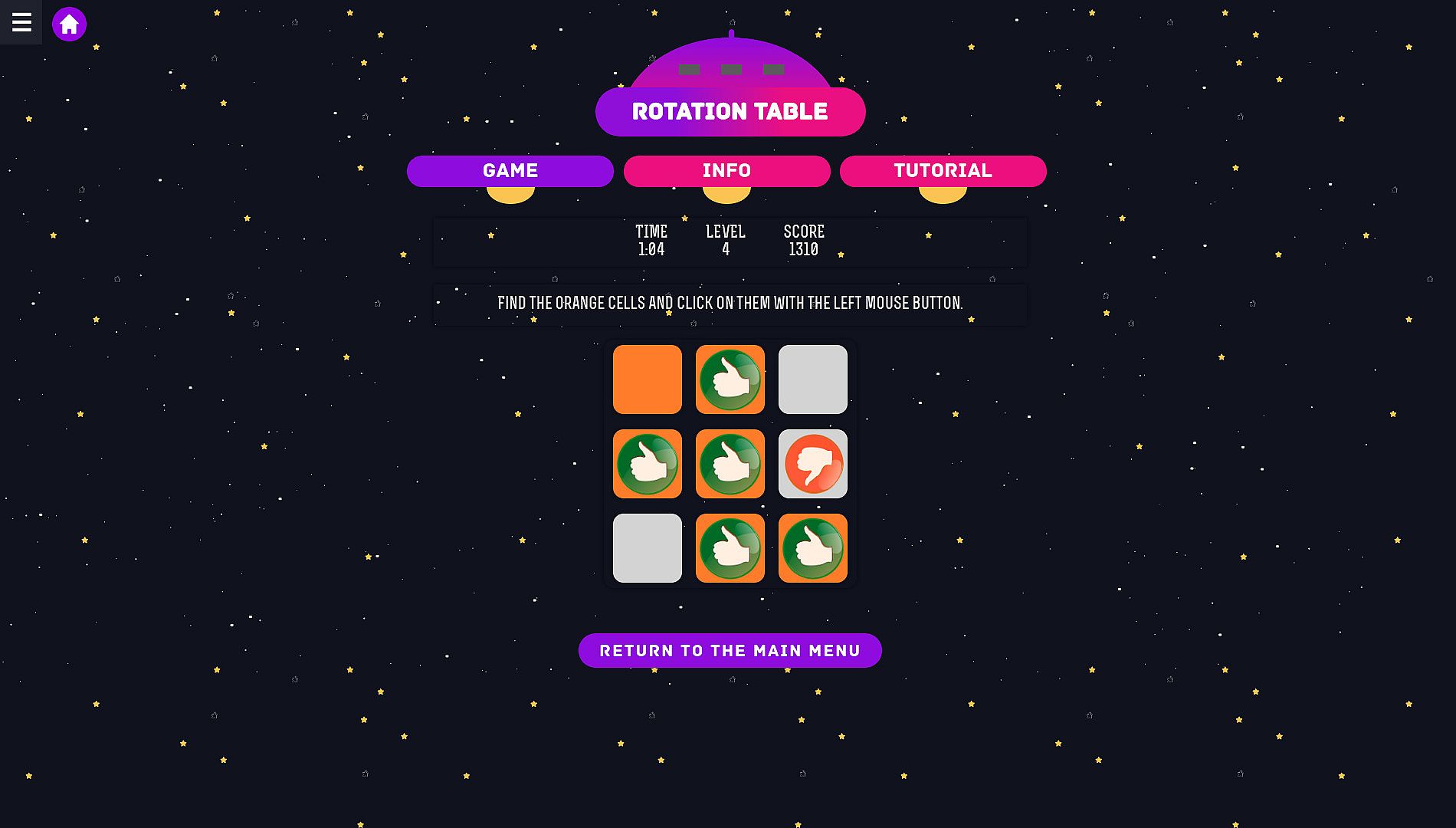 Rotation Table sharpens working memory through targeted exercises on PC. Players memorize orange cell positions on a table, then spot and click them after the table rotates. This indie brain trainer builds skills in temporary information storage and processing. The core loop repeats memorization, rotation, and precise left-click selection. It suits adults seeking focused mental workouts. Regular play hones recall under changing conditions.