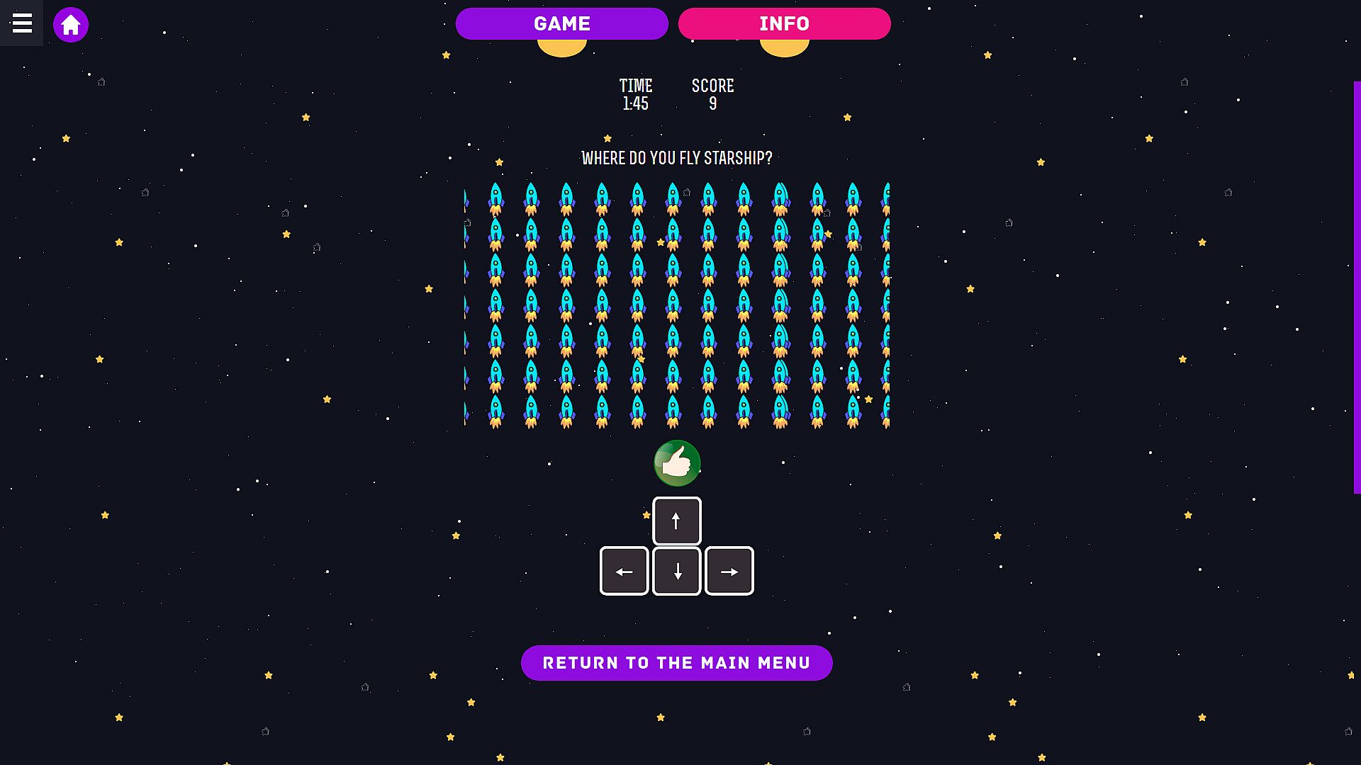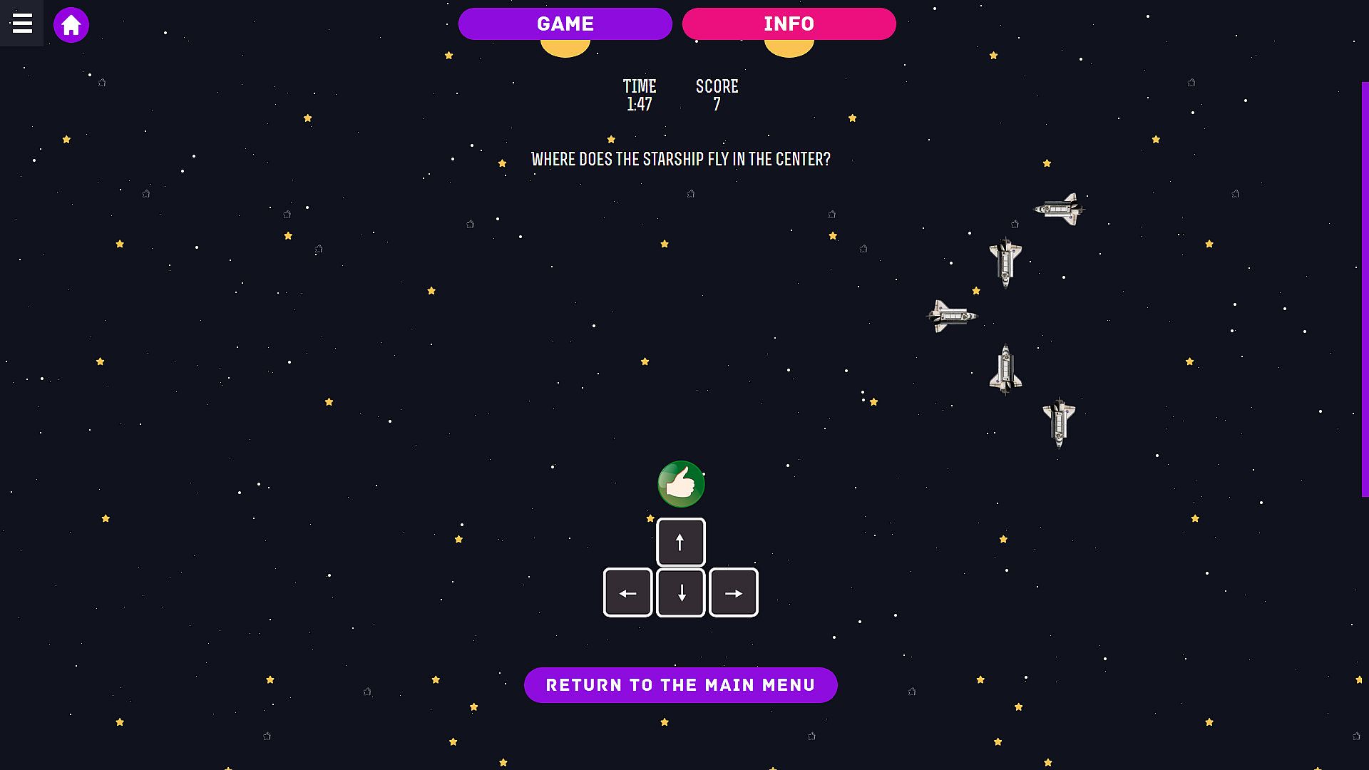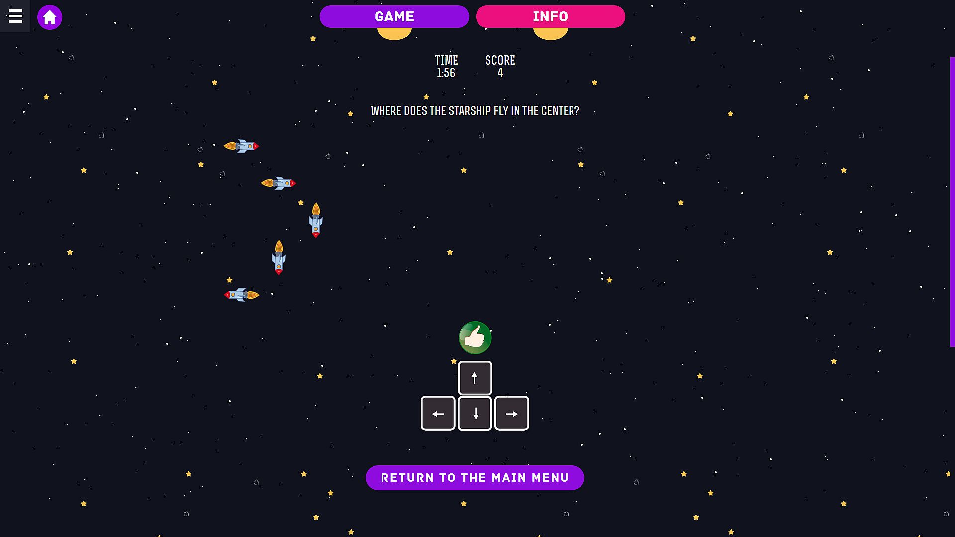 A game for flexible thinking. If the screen starships red, it is necessary to specify their direction. If the screen starships blue, you should specify their direction of movement.