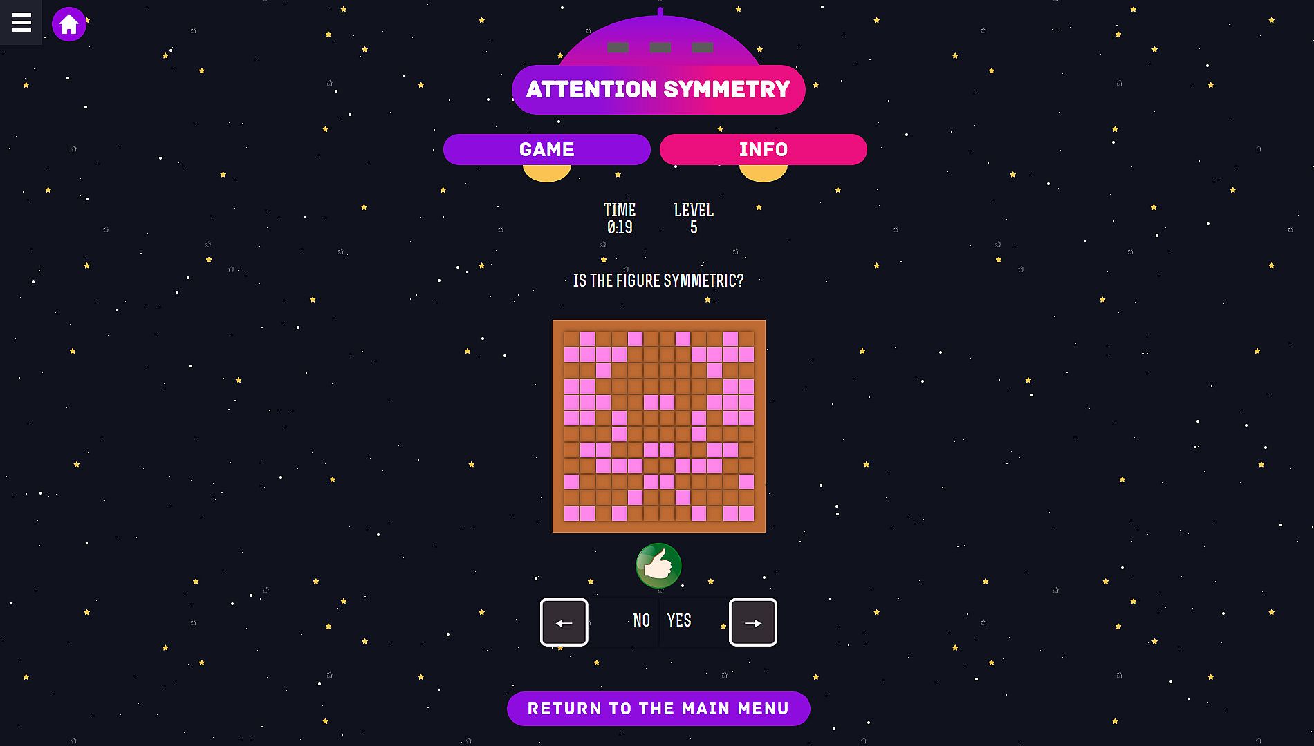 This exercise is for brain training, which improves memory and intellectual analysis. You will need to decide whether the displayed figure is symmetrical on the Y axis. (Symmetric means that its left side is the mirror image of the right side)
