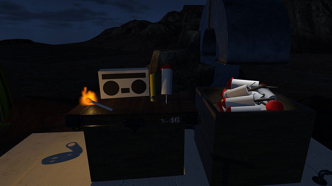 Fireworks Desert Blast is a technical demo designed for the HTC Vive that introduces players of all ages and skills to virtual reality. The demo offers light sandbox gameplay for players to explore their physical space and experiment with the physics engine. This is a great introduction for players who are new to VR.