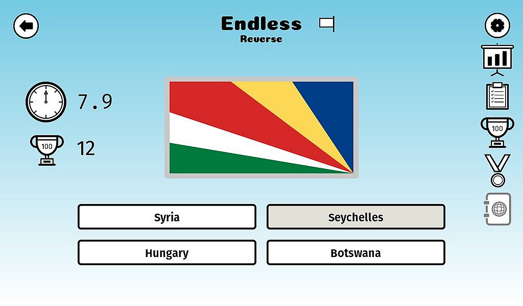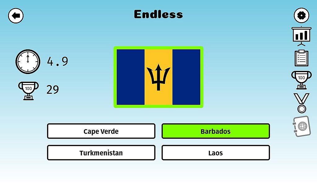 A non-timed mode in which a player can relax and play at their own speed. Players also have the option to specify which category of flags they would like to see in this mode. Use to prepare for the ultimate challenge: Endless.