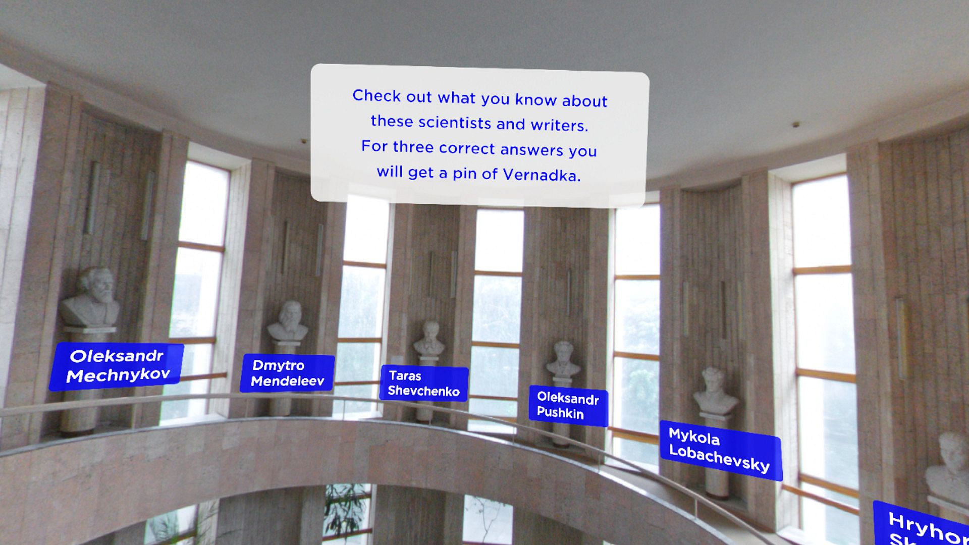 Put on the Lenovo Explorer headset for an immersive VR adventure through Kyiv. Two city guides lead you across six distinct spots in this ancient European capital. Travel from the House of Recordings and Theatre on Podil to the Cycletrack, Vernadskii National Library of Ukraine, UNIT.City park of innovations, and Art-Zavod Platforma. Listen to stories shared by the guides at each stop. Interact with objects to uncover more details and complete the experience. This adventure suits explorers who enjoy guided tours and hands-on discovery in virtual reality.