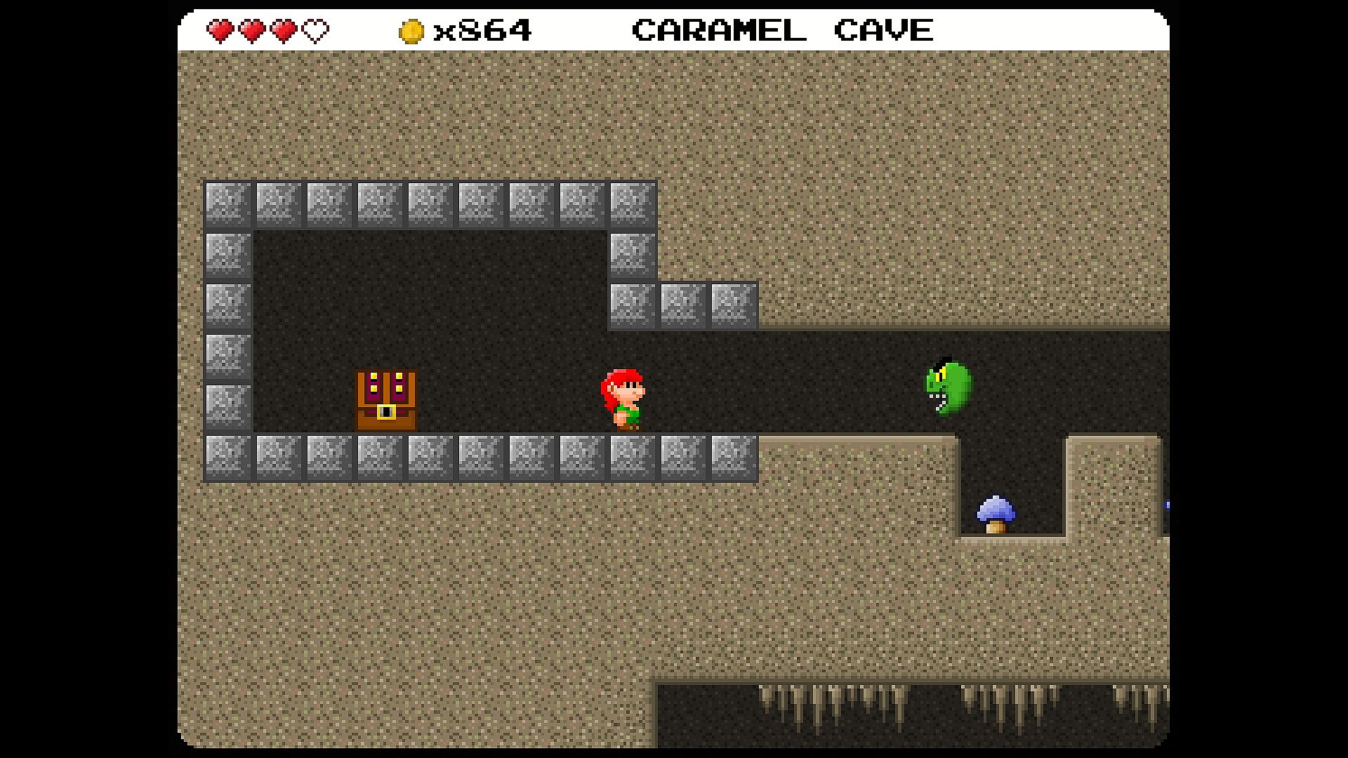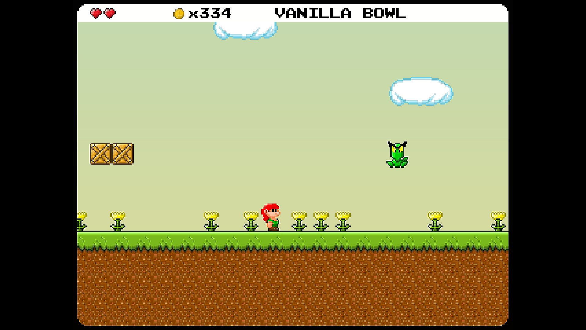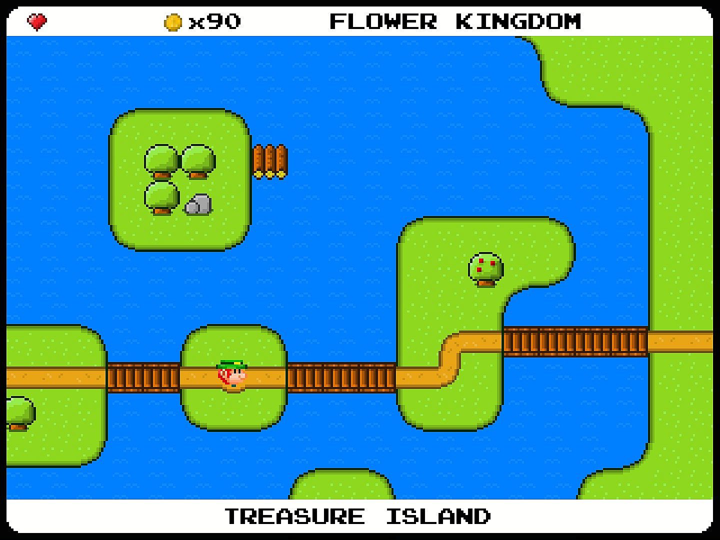 You explore the world using the map, so you can play the levels in a large variety of orders. Not all levels have to be played, but all of them contain stuff to find. There are also safe areas like the village of Happy Hill Homes, the Caravanserai in the desert, and the crazy hermit's shopping mall in Hermit Hollow. There you can talk to the locals and purchase upgrades like Extra Hearts or Double Jump Boots.