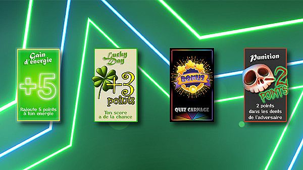 Each player answers each question individually, and will have to deal with the opponentās penalty choice! Bonus cards may help save the day by undoing the effects of the penalty or providing extra energy or score boosts.