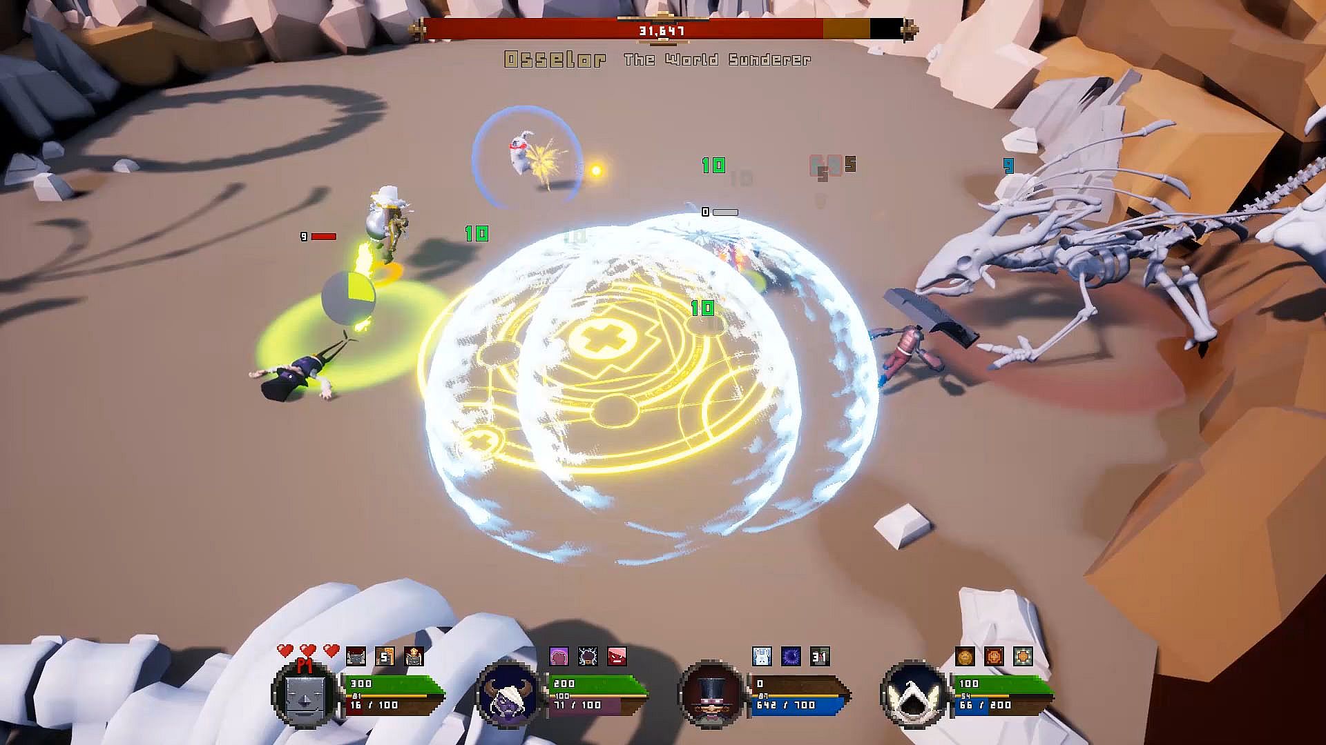 Four heroes clash with monstrous bosses in intense boss rush battles, demanding sharp skills and tight teamwork on a shared screen. Players pick from tank, paladin, mage, or demoness fighter, each with distinct styles that start simple but reward mastery. The tank draws aggro via taunts, slows foes with smashes, and cycles a shield that grows stronger from absorbed hits. Paladins heal through holy orbs that bounce between damage and support, while mages unleash escalating rabbit spells-fire, ice, or turrets-at mana cost, and fighters stack combo damage topped by a shadow duplicate ultimate. This indie action game on PC pushes seasoned players with its gameplay focus, where cooperation and precise timing decide victory over relentless bosses.