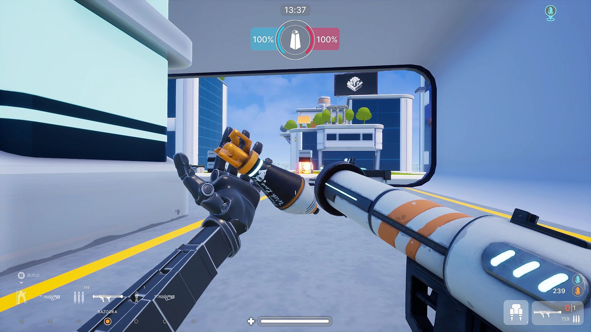 To protect their spawn each team must build around it and place defenses. Place high external walls to prevent players without a jetpack from getting in, stairs to have the high ground on your enemy or turrets to blast any enemy in a close radius. There are other building parts such as walls, a vehicule pad, corridors, doors and so on.