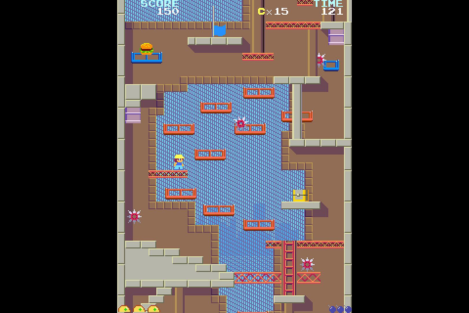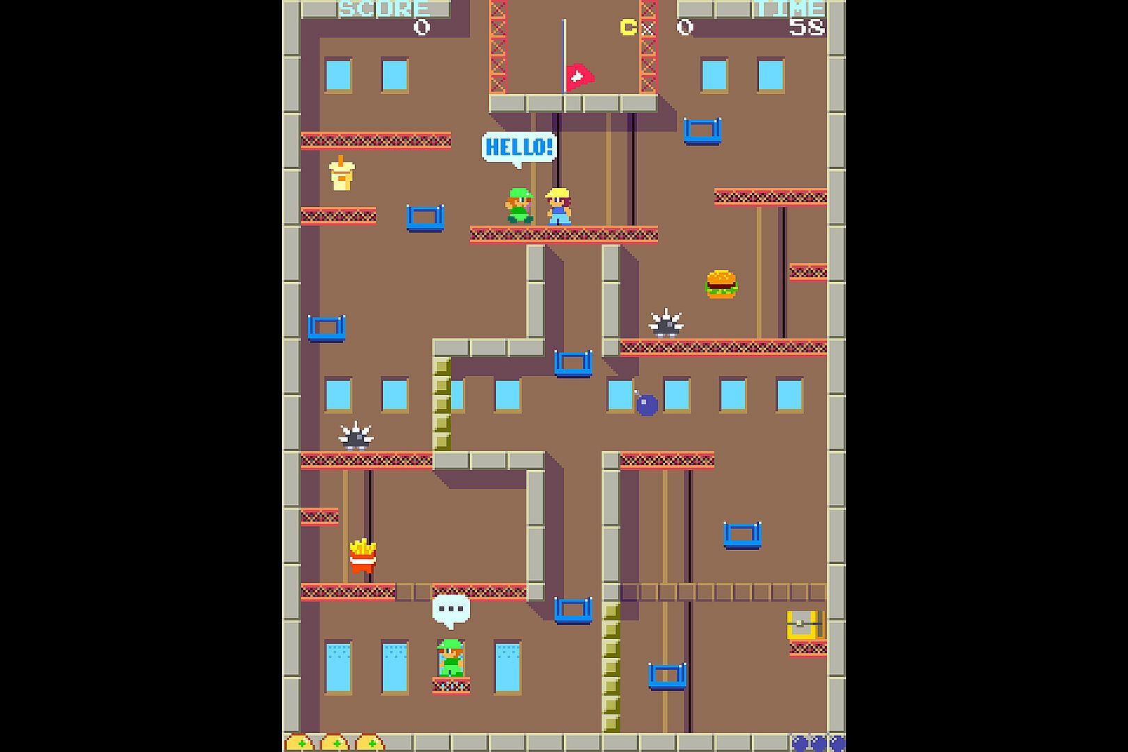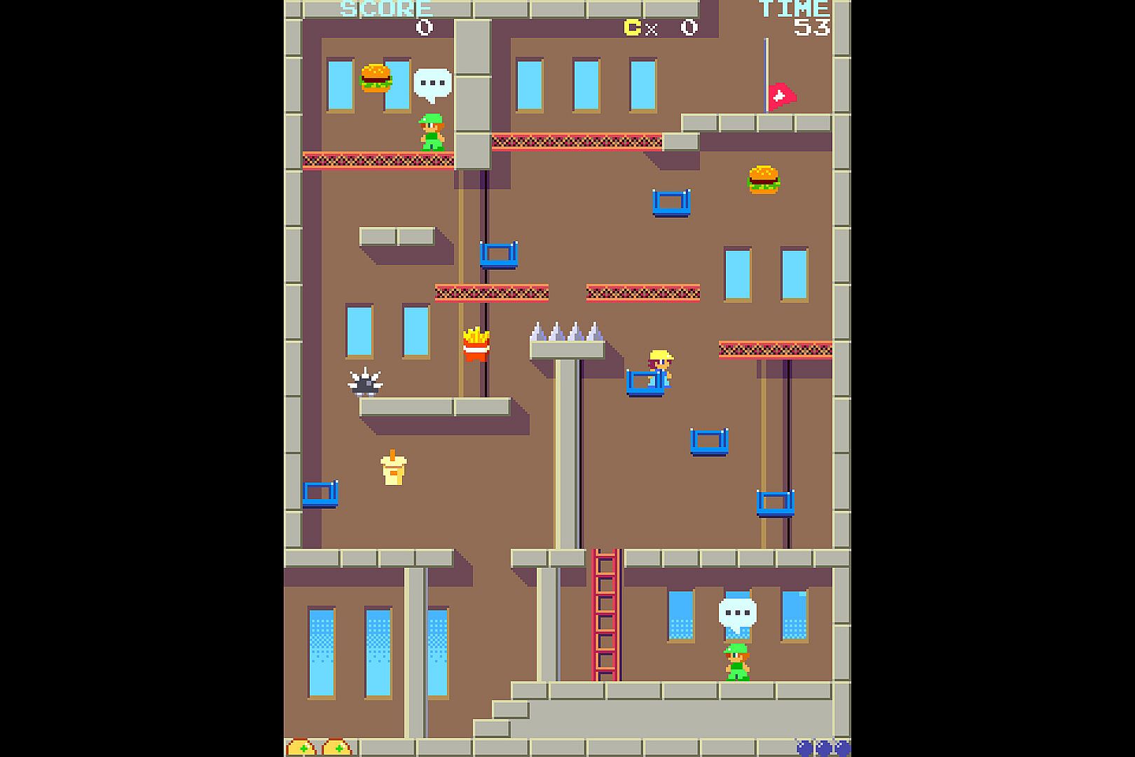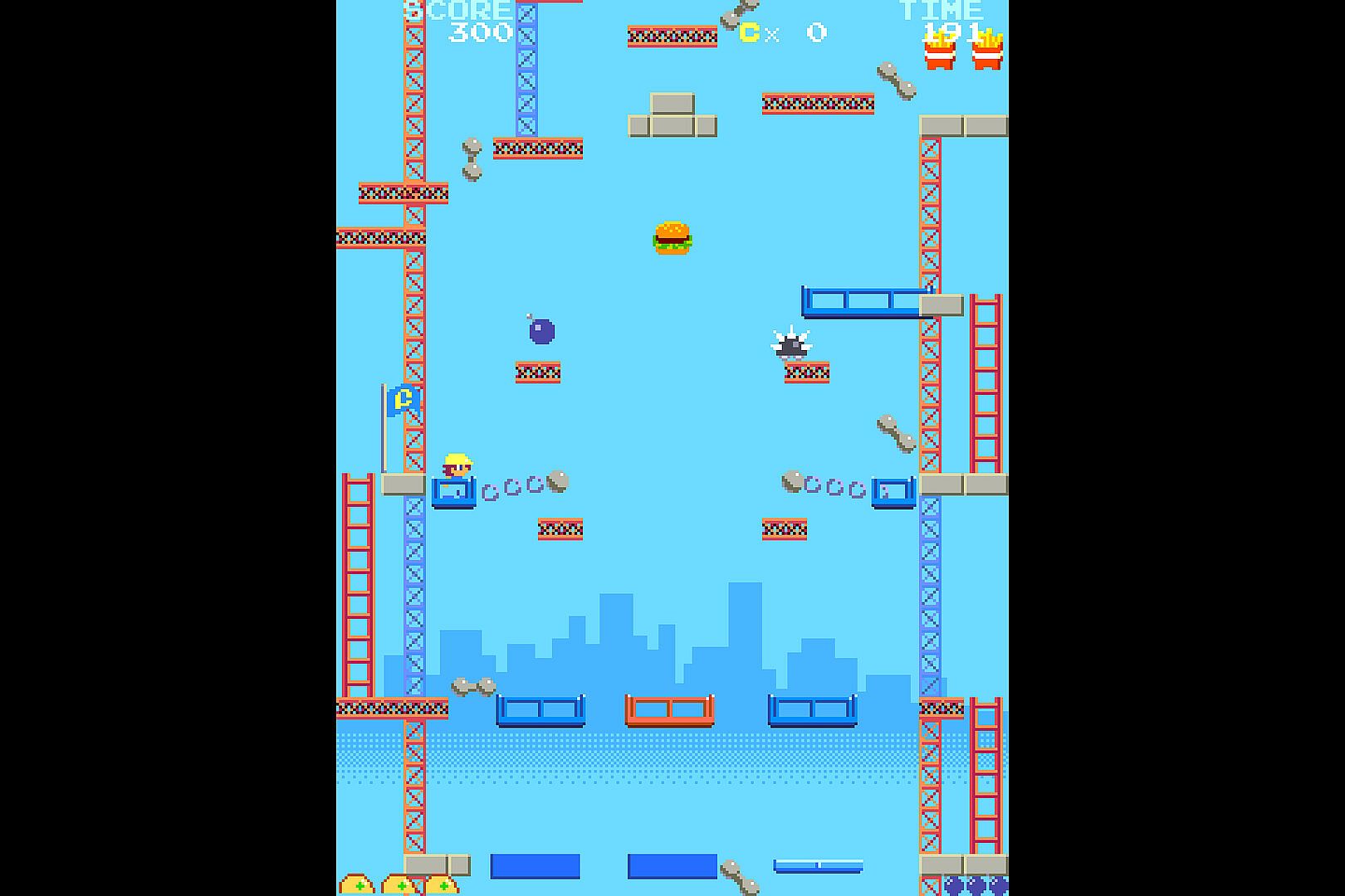 Climb towering construction sites in this platform action game, hurling bombs at foes to clear your path upward. Navigate 12 stages filled with birds, rolling wheels, and spikes that demand quick dodges. Spot burgers, fries, and drinks along the way to rack up bonus points-hit 10,000 to gain an extra stock life. Push toward the red flag at the top while mastering enemy patterns in fast-paced casual play. This setup rewards precise throws and evasion for steady progress. Casual action fans who enjoy bite-sized challenges and score-chasing runs will find it hits the mark.